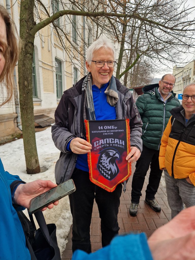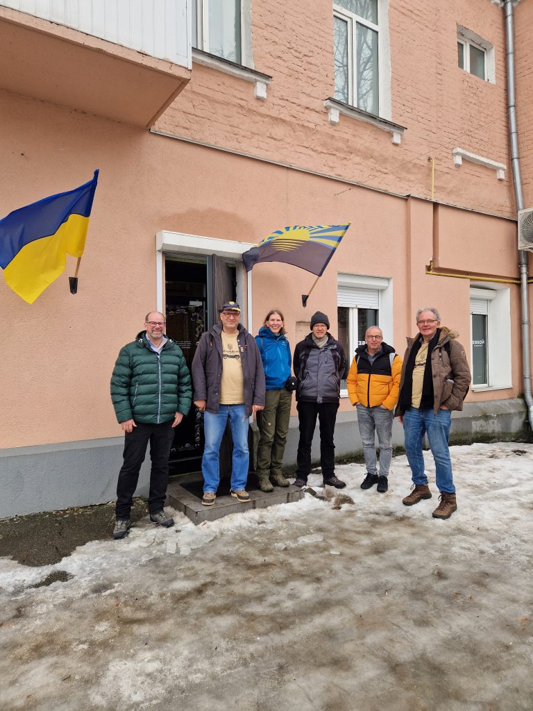 Um 1100 holen uns Yuriy und Alena von SAP mit dem Kleinbus ab, und wir fahren auf die linke Seite des Dnipro. Für den Samstagnachmittag ist ein Museumsbesuch geplant und – wie bei den bisherigen Fahrten – ein gemeinsames Abendessen vor der Rückfahrt mit dem Zug. Daher wollte ich gerne den Sonntagvormittag mit etwas aus meiner Sicht „Sinnvollem“ verbringen, also z.B. irgendwo mithelfen, Schutt wegzuräumen, Suppe zu kochen, Drohnenschutznetze zu knüpfen. Letzten Oktober konnten wir einer Hilfsorganisation im Hub ein bisschen Zeit schenken, indem wir halfen Erste-Hilfe-Päckchen zusammenzustellen. Diesmal erklärt mir Anna, die Direktorin von SAP Ukraine, vor der Abfahrt: „Es ist gut, wenn Ihr auf dem östlichen Dnipro-Ufer die Menschen besucht und Euch anschaut, wie wir uns untereinander helfen. Ihr könnt dann über diese Erfahrungen berichten. Und so fahren wir morgens über den Fluss Richtung Osten.