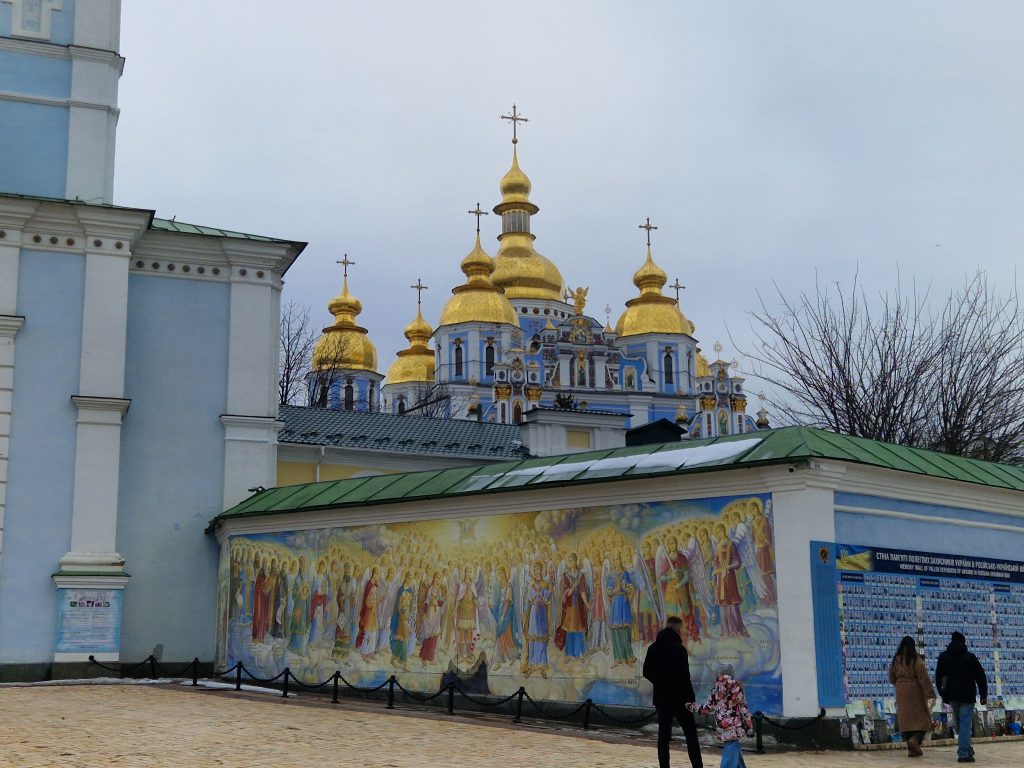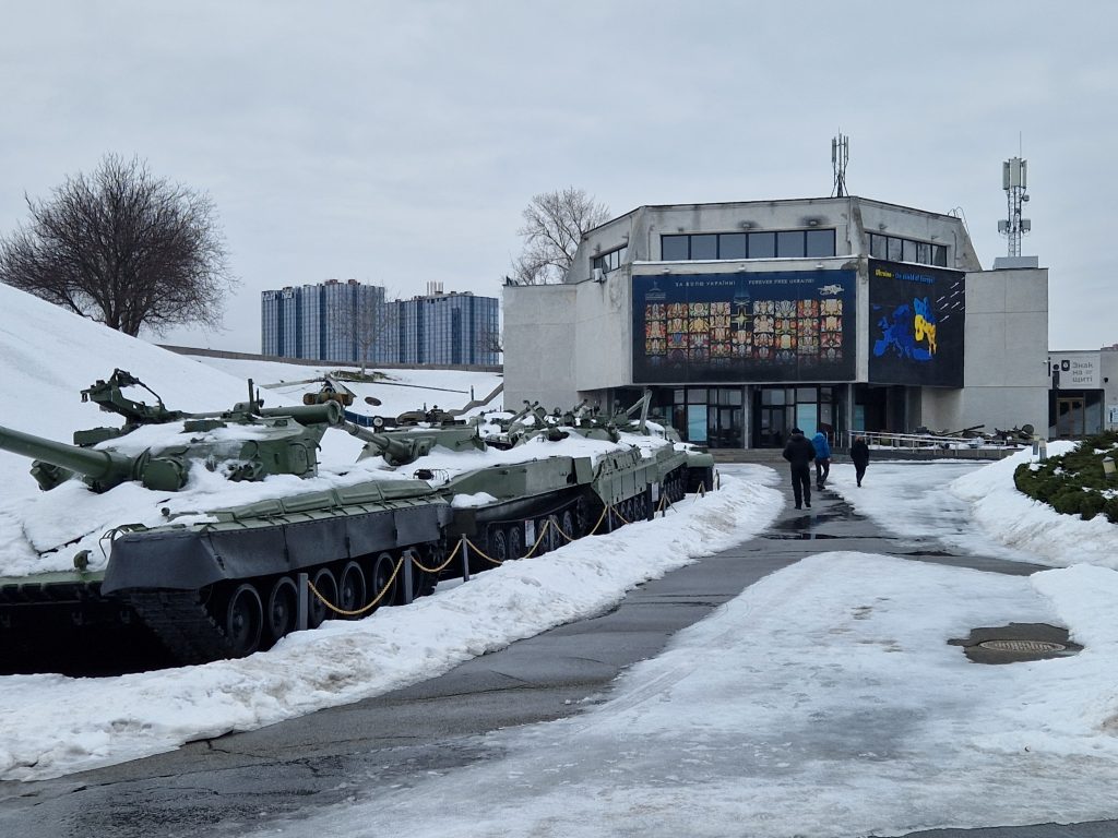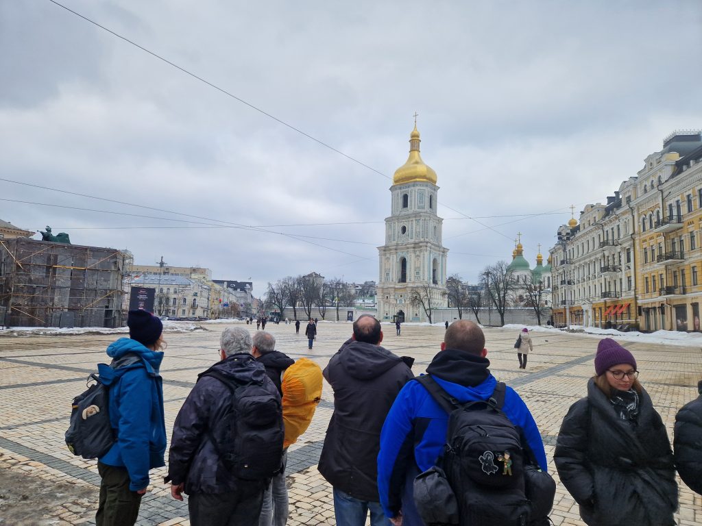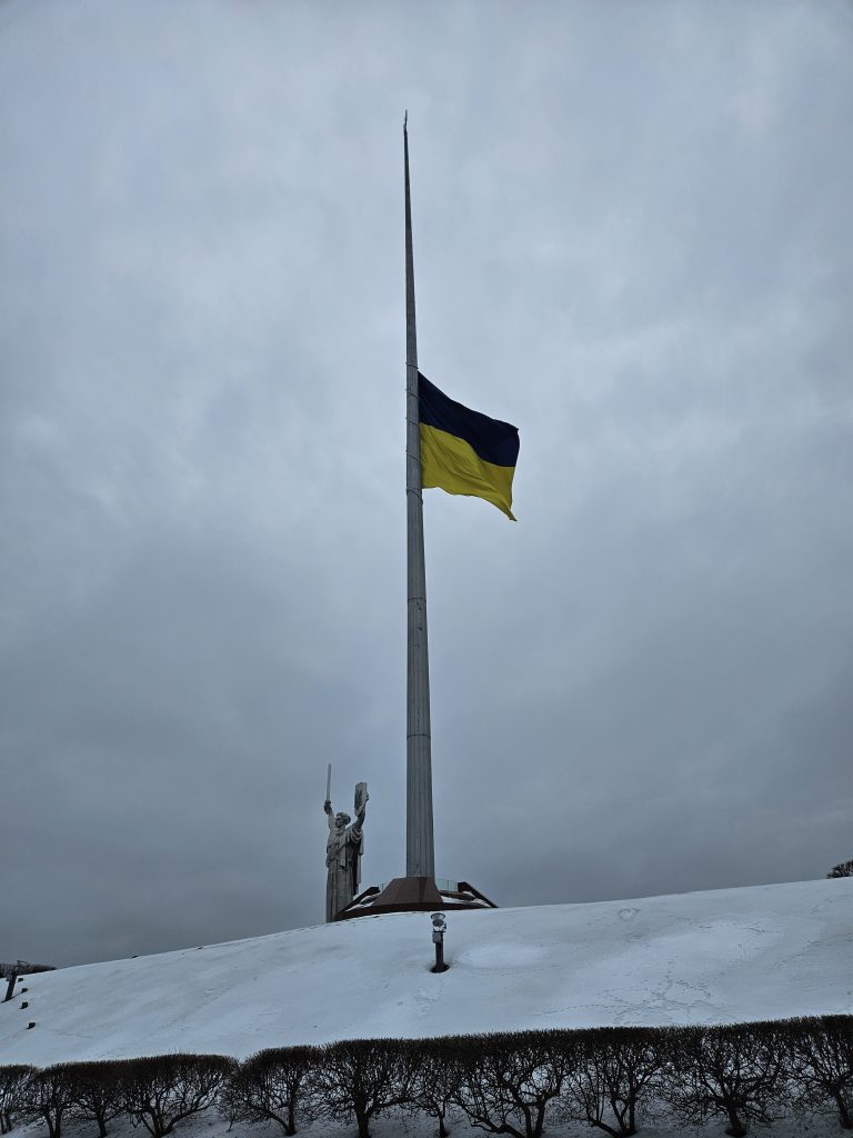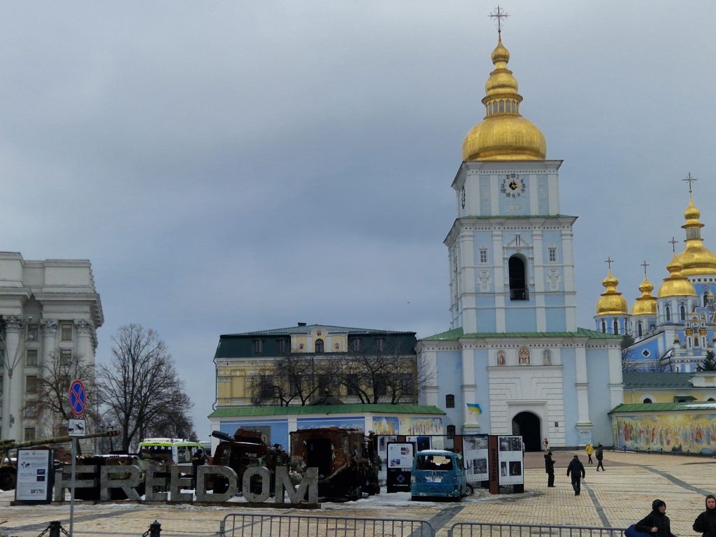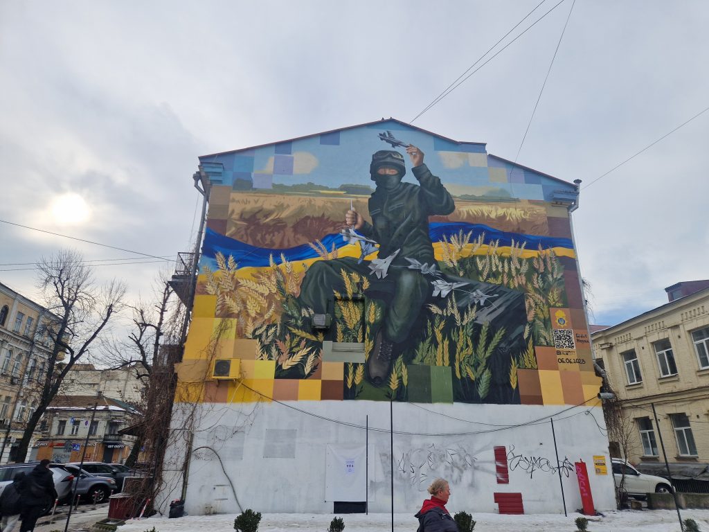 Wir haben machen uns auf den Weg hoch in die Stadt und kaufen als erstes bei L’viv Handmade Chocolates noch Mitbringsel für Daheim. Die Straßen sind geräumt, die Gehwege zumindest mit Split und Sand bestreut. Manche Abschnitte der Bürgersteige sind mit rotweißen Bändern abgesperrt. Dort fallen von den Dächern im Tauwetter immer wieder Eisplatten herab. Wir laufen hoch zur St. Andreas Kirche, weiter auf den Sophienplatz und schließlich auf den Platz vor dem Michaelskloster, auf dem – seit kurz nach Beginn der Vollinvasion – zerstörte Fahrzeuge stehen. Auch die Ausstellung, die Bilder von der Zerstörung Mariupols mit der Situation von Warschau im zweiten Weltkrieg vergleicht, ist noch zu sehen. Unser Weg führt uns weiter zur Glasbrücke und zum Denkmal der Völkerfreundschaft. Wir blicken hinunter auf den Dnipro. Hier fließt er. An anderen Stellen ist er zugefroren. Direkt neben der Brücke ist eine eindrückliche Installation: Ein Stück Straße mit Drohnenschutznetzen ist nachgebaut, so dass man einen Eindruck bekommt, wie derzeit im Süden in Städten wie Kherson die Logistik, aber eben auch die Zivilbevölkerung vor russischen Kamikazedrohnen geschützt werden. Weiter geht’s zum Maidan Nezaleshnosti. Das Fahnenfeld ist zugeschneit. Zum Teil schauen die kleinen blau-gelben Fähnchen kaum noch aus dem Schnee heraus.