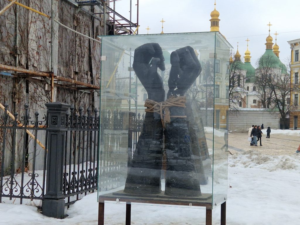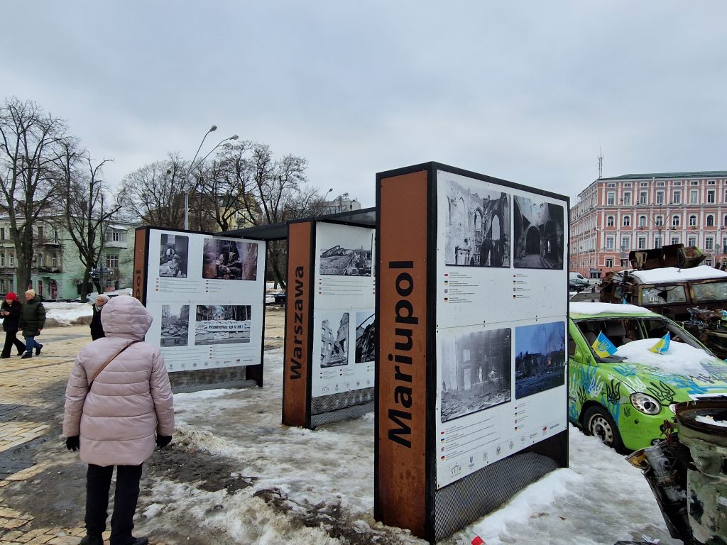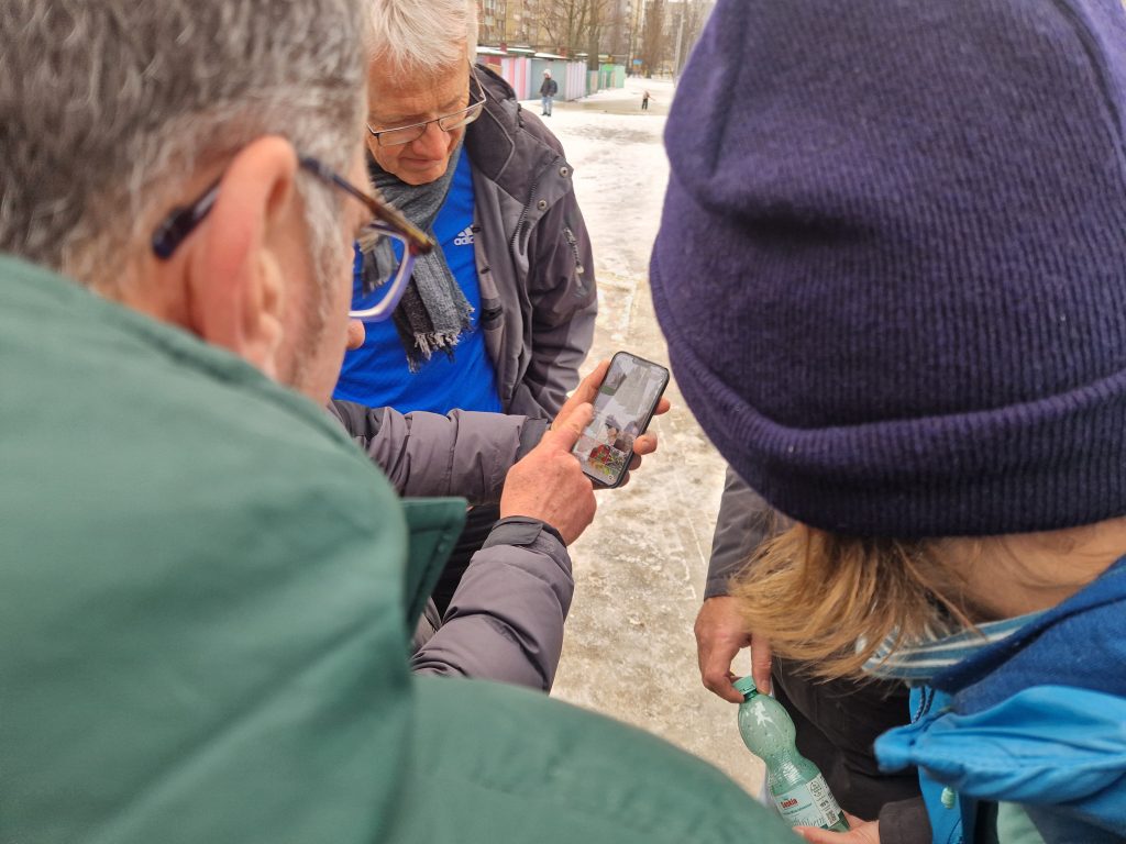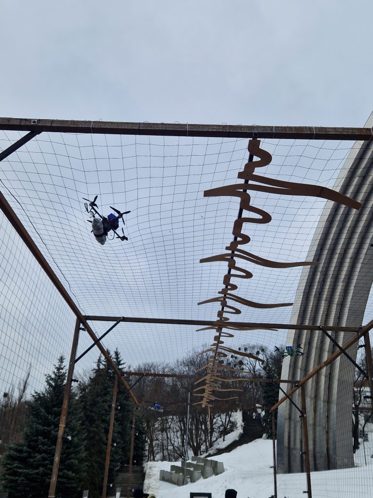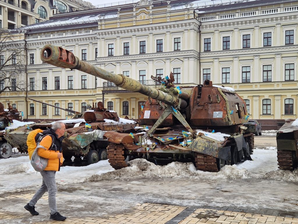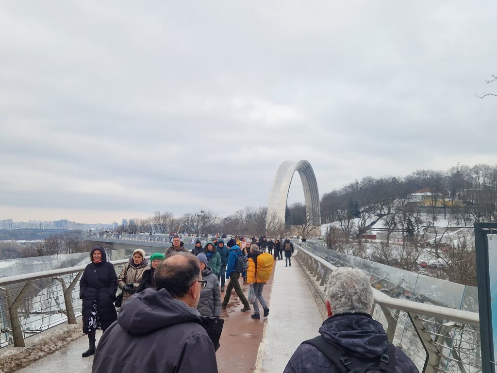 Wir haben machen uns auf den Weg hoch in die Stadt und kaufen als erstes bei L’viv Handmade Chocolates noch Mitbringsel für Daheim. Die Straßen sind geräumt, die Gehwege zumindest mit Split und Sand bestreut. Manche Abschnitte der Bürgersteige sind mit rotweißen Bändern abgesperrt. Dort fallen von den Dächern im Tauwetter immer wieder Eisplatten herab. Wir laufen hoch zur St. Andreas Kirche, weiter auf den Sophienplatz und schließlich auf den Platz vor dem Michaelskloster, auf dem – seit kurz nach Beginn der Vollinvasion – zerstörte Fahrzeuge stehen. Auch die Ausstellung, die Bilder von der Zerstörung Mariupols mit der Situation von Warschau im zweiten Weltkrieg vergleicht, ist noch zu sehen. Unser Weg führt uns weiter zur Glasbrücke und zum Denkmal der Völkerfreundschaft. Wir blicken hinunter auf den Dnipro. Hier fließt er. An anderen Stellen ist er zugefroren. Direkt neben der Brücke ist eine eindrückliche Installation: Ein Stück Straße mit Drohnenschutznetzen ist nachgebaut, so dass man einen Eindruck bekommt, wie derzeit im Süden in Städten wie Kherson die Logistik, aber eben auch die Zivilbevölkerung vor russischen Kamikazedrohnen geschützt werden. Weiter geht’s zum Maidan Nezaleshnosti. Das Fahnenfeld ist zugeschneit. Zum Teil schauen die kleinen blau-gelben Fähnchen kaum noch aus dem Schnee heraus.