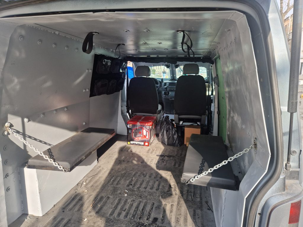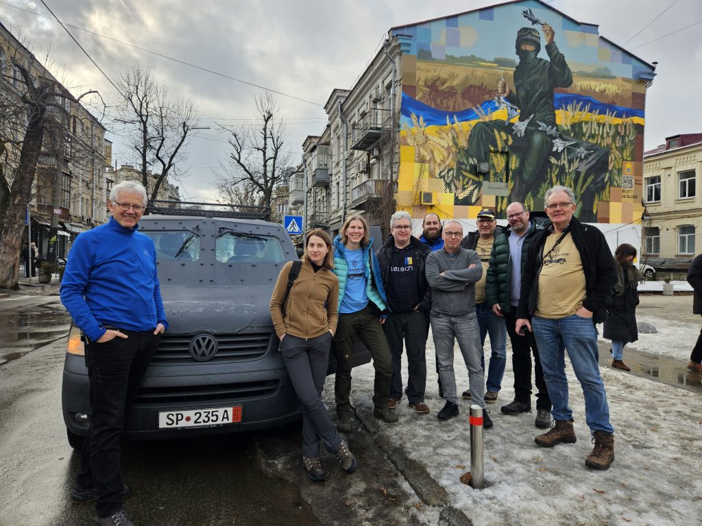 Wir stellen ein paar nebeneinander, um als Gruppe zusammen zu sitzen. Anschließend laufen wir zum Hub und übergeben ein paar Pakete für eine Hilfsorganisation, zu der eine unserer Sängerinnen Kontakt hat. Dann fahren wir zu Nova Poshta weiter. Wir entladen die Krankenhaus-Materialien, und Niklas und Martin fahren im VW Bus mit Ruslan zur Werkstatt von Bobrik Motor. Der VW T5 wird zu einem Evakuierungsfahrzeug umgebaut, und die beiden können vor Ort mit den Mechanikern sprechen. Sie erfahren, dass die Lebensdauer der sog. „Casevacs“ (Casualty Evacuation Vehicles“ zwar oft begrenzt ist, denn sie werden gezielt von russischen Drohnen angegriffen, aber jedes Fahrzeug rettet im Schnitt 70 Menschen das Leben. Wir sind sehr froh, dass wir dazu mit unseren Fahrzeugen einen Beitrag leisten können – mit inzwischen über zwanzig von uns beschafften Casevacs ist das eine signifikante Menge. Auf dem Rückweg können Niklas und Martin mit Ruslan den VW T5 nach Kyiv zurückbringen, den wir im vergangenen Sommer zunächst nach L’viv gefahren hatten. Er wurde dort in den vergangenen Monaten teilweise mit Stahl, aber auch teilweise mit leichtem Material gepanzert und jetzt in Kyiv zu Ende umgebaut.
