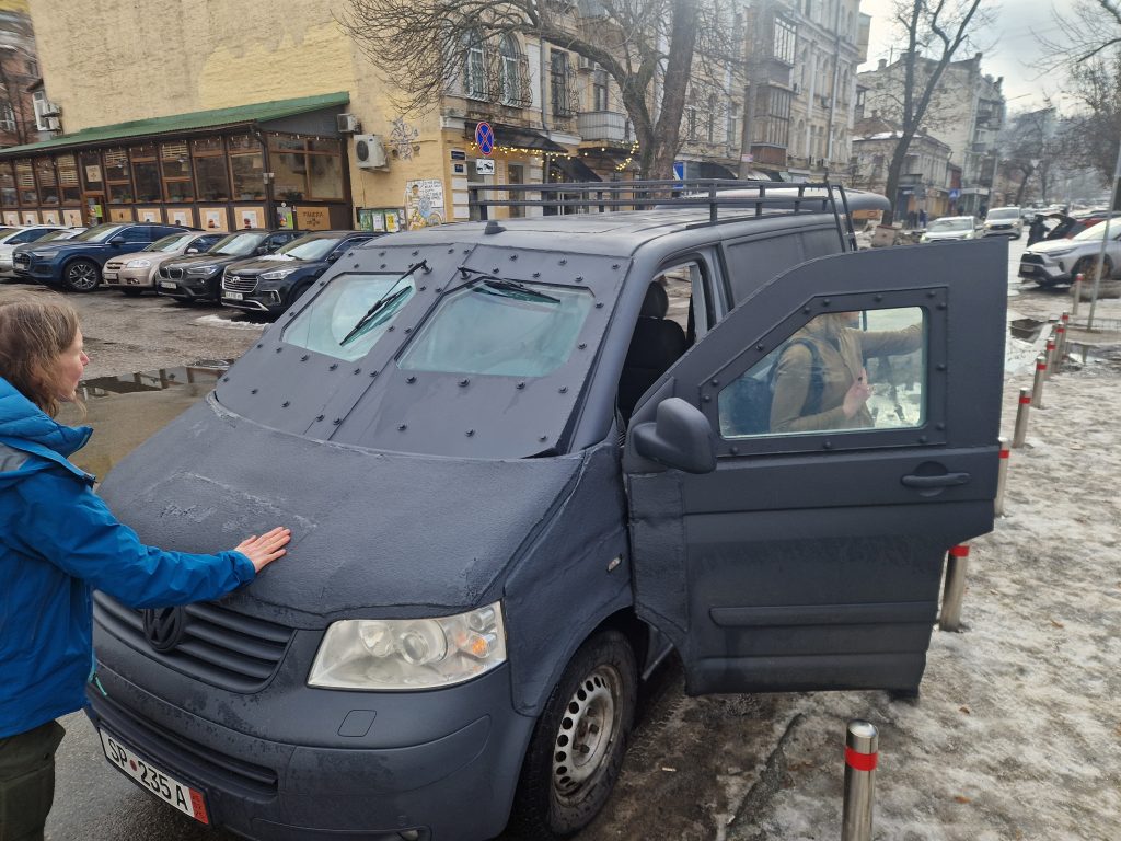 Martin, Niklas und Ruslan kehren von der Werkstatt zurück und haben den gepanzerten VW Bus dabei. Wir gehen vor die Tür und Ruslan erklärt uns nochmal die Besonderheiten. Der gepanzerte VW Bus ist ein Prototyp. Die Panzerung ist leicht genug, so dass der 2.8l Motor des Kleintransporters noch für ausreichende Beschleunigung und gutes Fahrverhalten sorgt. Sie ist dazu gedacht, bei einem möglichen Drohnenangriff, oder auch im Fall, dass das Fahrzeug auf eine Mine fährt, die Insassen zu schützen. Die Zerstörung des Fahrzeugs wird in Kauf genommen. Die Beschaffung plus Panzerung war teuer – aber nicht so teuer wie der Erwerb ein neuen, von vornherein gepanzerten Fahrzeugs. Der Betrag für die Durchführung des Umbaus lag dann aber doch deutlich außerhalb des Rahmens, den Lawyers‘ Move sonst finanziert. Ruslan erklärt uns dazu die Berechnungen, einschließlich des angenommenen Wertes eines jeden Menschenlebens, das dieses Fahrzeug retten kann. Buchhaltung zu Kriegszwecken. Nach ein paar Fotos fährt Ruslan los und bringt den VW T5 nochmal zum Reifenwechsel, bevor er den Empfängern übergeben wird.