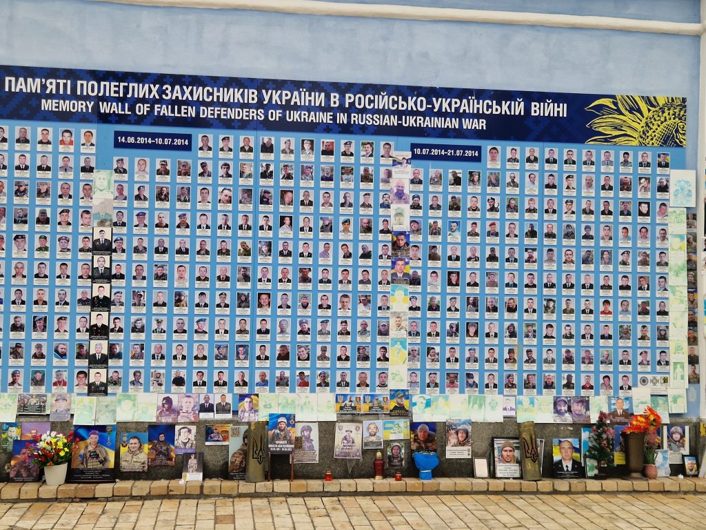 Im Museum für das Gedenken an den zweiten Weltkrieg, im Sockel der Statue, ist die Sammlung im Erdgeschoss einer Ausstellung über ausländische Freiwillige gewichen, die den ukrainischen Streitkräften beigetreten sind. In einem großen Halbkreis sind jeweils Stationen einzelnen Personen gewidmet. Die auf der Innenseite dargestellten Personen sind bereits gefallen, und ihre Familien haben zugestimmt, dass ihre Uniformen, sowie z.B. persönliche Gegenstände oder Auszeichnungen hier ausgestellt werden. Man erfährt etwas über ihr Leben und ihre Motivation. Besonders beeindruckt mich der erhaltene Handychat zwischen einem Kämpfer und seinem Vater, kurz bevor der junge Mann ums Leben kam, als im Sommer 2024 in Kramatorsk eine russische Rakete eine Pizzeria in Kramatorsk traf.