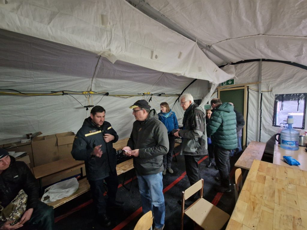 Als wir aus dem Gebäude kommen, hat heftiger Schneefall eingesetzt, und die Temperaturen sind wieder unter null. Wir laufen wieder zum Bus und Yuriy fährt uns routiniert durch die verschneiten Straßen. Wir gehen ins traditionelle Restaurant Poltava, wo wir zu Abend essen. Sergey kommt dazu und bringt uns u.a. selbst designte Klettpatches für Pickup4Ukraine – für alle Fahrer und Fahrerinnen. Yuriy fährt uns anschließend zum Bahnhof. Wir haben uns für den frühen Nachtzug um kurz nach 8 Uhr abends entschieden, um am nächsten Tag nicht Gefahr zu laufen, unseren Heimflug ab Krakau zu verpassen.
