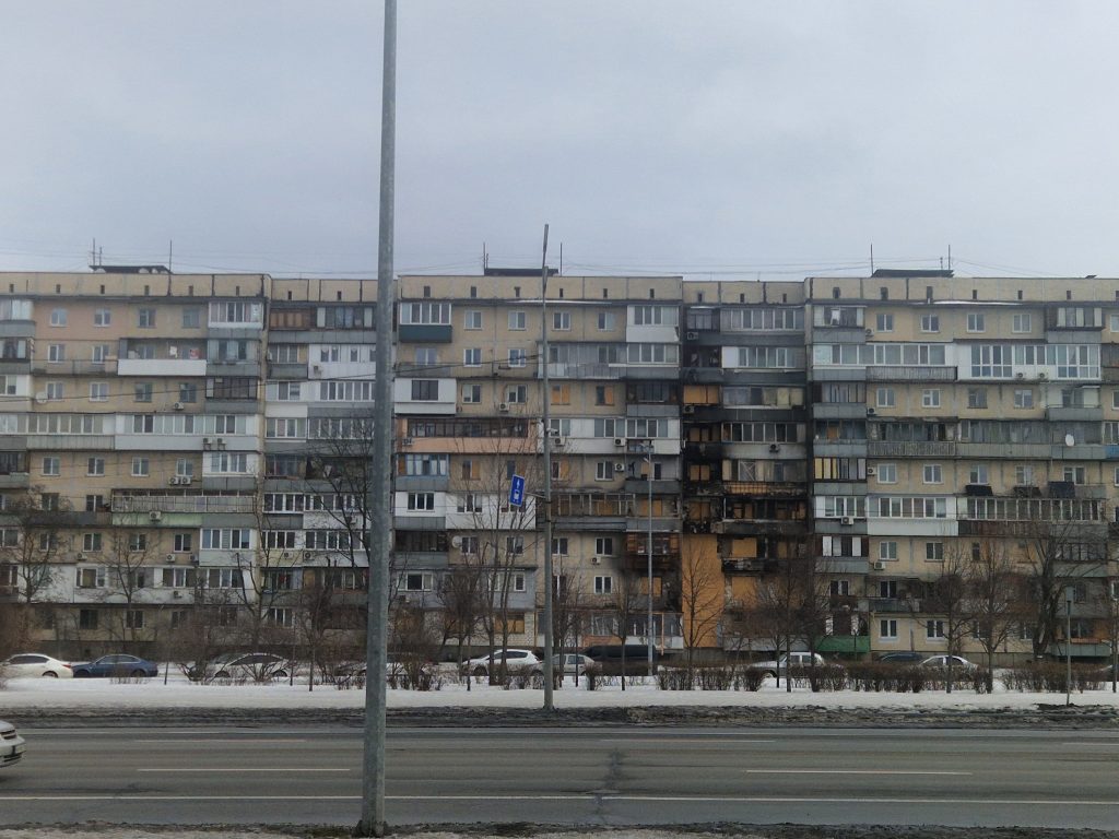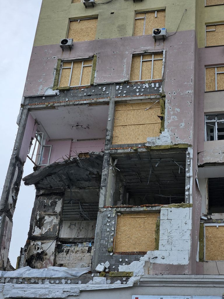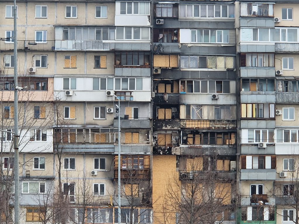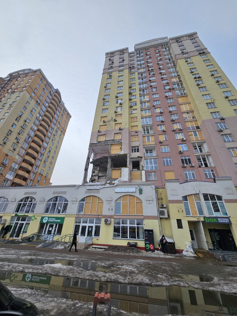 Wir fahren weiter in den Stadtteil, in dem Alena wohnt. Sie zeigt uns zwei Gebäude, in die russische Drohnen eingeschlagen sind. Sie hat die Angriffe von ihrer Wohnung im 15. Stock aus beobachte. Es gibt keine militärische Infrastruktur weit und breit. Ein Krankenhaus steht in der Nähe, und eine Schule. In dem einen getroffenen Gebäude ist eine Wohnung ausgebrannt und ringsherum sind Fensterscheiben durch die Explosion geborsten und durch Holzplatten ersetzt. Die Familie in der betroffenen Wohnung konnte sich nicht mehr retten, weil sie im fensterlosen Bad Zuflucht gesucht hatten, und dann den Flammen nicht mehr entkamen.