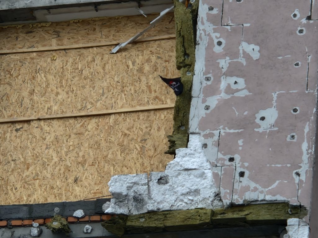 In dem anderen Gebäude sieht man ein riesiges klaffendes Loch, ganze Wohnungsteile fehlen auf anderthalb Stockwerken, allein der tragende Eckpfeiler steht noch und hält die Wohnungen darüber. Er ist angeknickt, aber die Stahlarmierung im Beton hält. Jemand hat – offenbar aus schierem Trotz – eine Piratenflagge angebracht, die im kalten Wind an der Ruine flattert.
