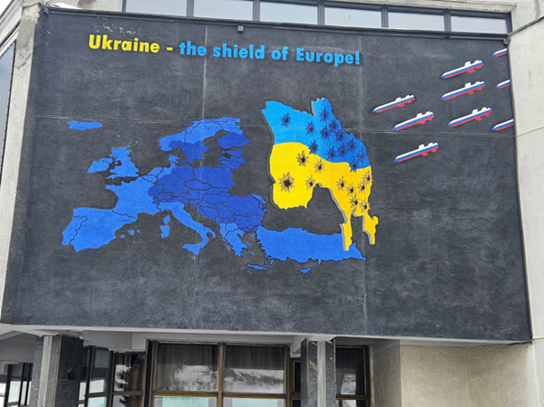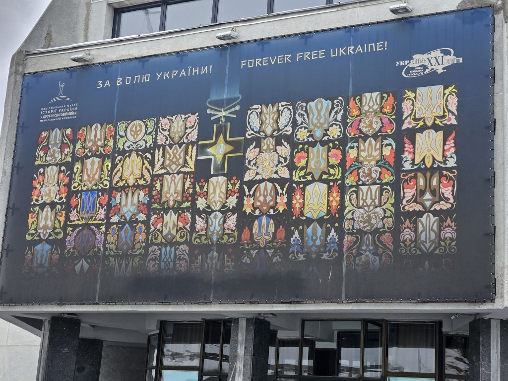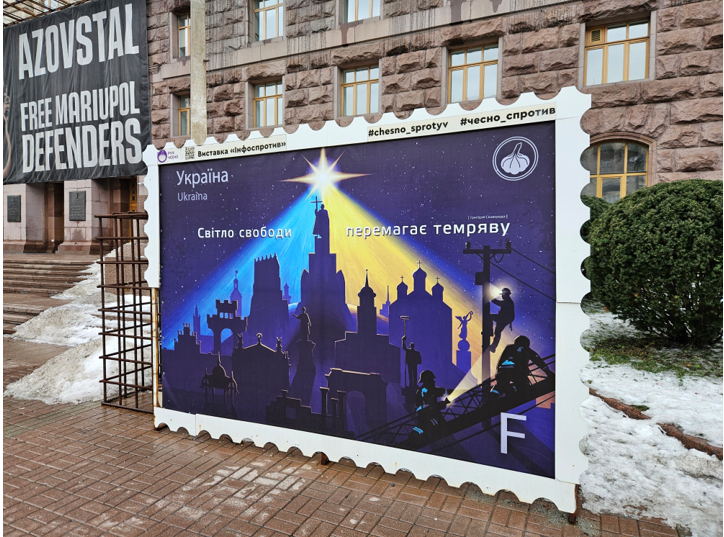 Wir laufen zum Rathaus und bewundern die neueste Briefmarke, die vor dem Gebäude ausgestellt ist. Sie steht unter der Überschrift: „Das Licht des Sieges überwindet die Finsternis“ und ist denjenigen gewidmet, die nach russischen Angriffen auf die Energie-Infrastruktur immer wieder reparieren und instandsetzen.