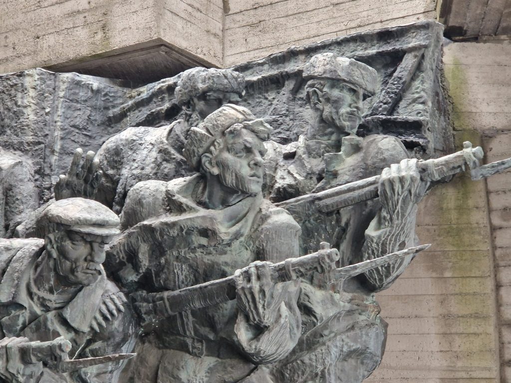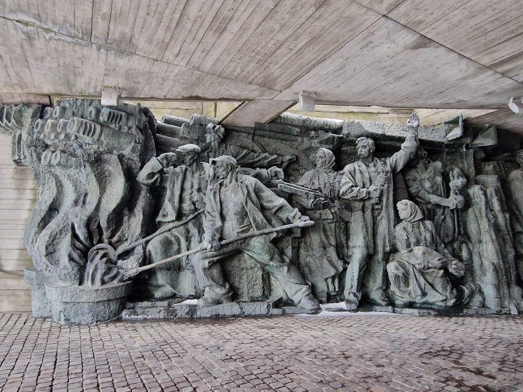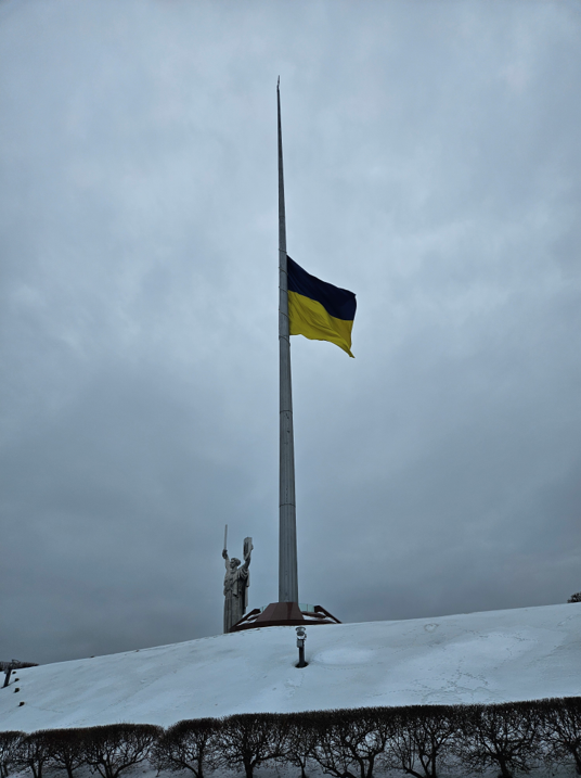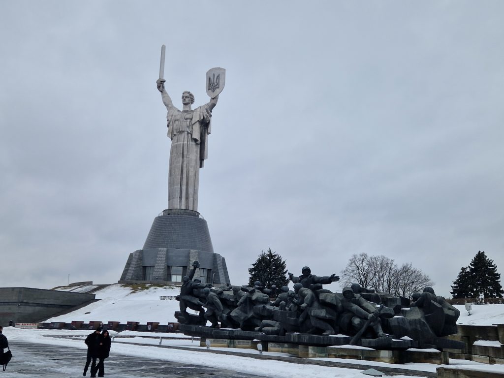 Wir kehren auf die westliche Flussseite zurück und besichtigen das Gelände rund um die dauerhaft auf Halbmast geflaggte größte ukrainische Fahne und die Mutterlandsstatue. Auf dem Schild, den sie hochhält, wurden nach Beginn der Vollinvasion Hammer und Sichel ersetzt durch den Dreizack. Das Gelände selbst ist in den achtziger Jahren des Vergangenen Jahrhunderts angelegt worden. Dominierend sind Wandreliefs entschlossener Kämpferinnen und Kämpfer in brutalistischem sowjetischem Stil. Heute wirkt das etwas aus der Zeit gefallen. Es ist deutlich kälter geworden und ein leichter Schnee fällt. Wir gehen ins Museum.